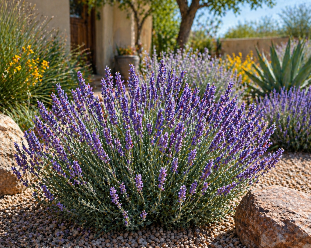 Lavender is especially useful when a xeriscape feels too hard or rocky. It softens gravel, stone, succulents, and structural plants with color and fragrance.